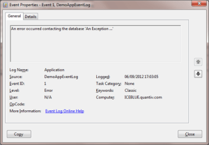 If we open the previous XML output from the C:\logs\DemoApp.svclog file generated above, in the Service Trace Viewer, we see the following detailed breakdown. Our Error message is highlighted in red and the details of the event are decomposed into discrete sections in the UI.