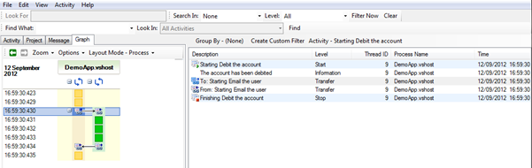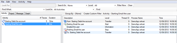 You will start to see you code can become quite complex as you add Activity tracing information; this is due to having to close off any Start or Transfer Activity. To ensure you close off any Starts or Transfers, you need to make sure you catch any errors and in the finally section of the code call the appropriate Stop or Transfer back.